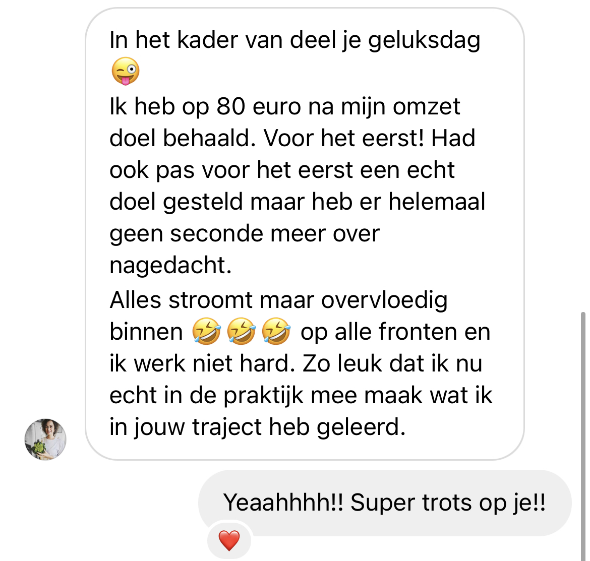 De afgelopen maanden heb je naast me gelopen en me aangemoedigd om eens een laagje dieper te onderzoeken wie ik ben en waar mijn verlangens werkelijk liggen. Toen in instapte was ik vooral erg bezig met doelen rondom het verstevigen van de basis van mijn bedrijf, maar dit traject heeft me ook op persoonlijk vlak zo ontzettend veel gebracht. En die twee kunnen eigenlijk ook niet zonder elkaar, dat heb ik absoluut ervaren!