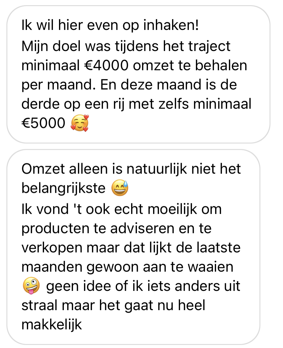 Mijn producten zijn duidelijk, ik ben nu echt een fantastische workshop aan het neerzetten, er is meer structuur in mijn zichtbaarheid online, de combinatie werk-prive wordt steeds beter en zo kan ik nog wel even door gaan. Authentiek ondernemen is nu een stuk makkelijker geworden en geeft me toch veel energie!